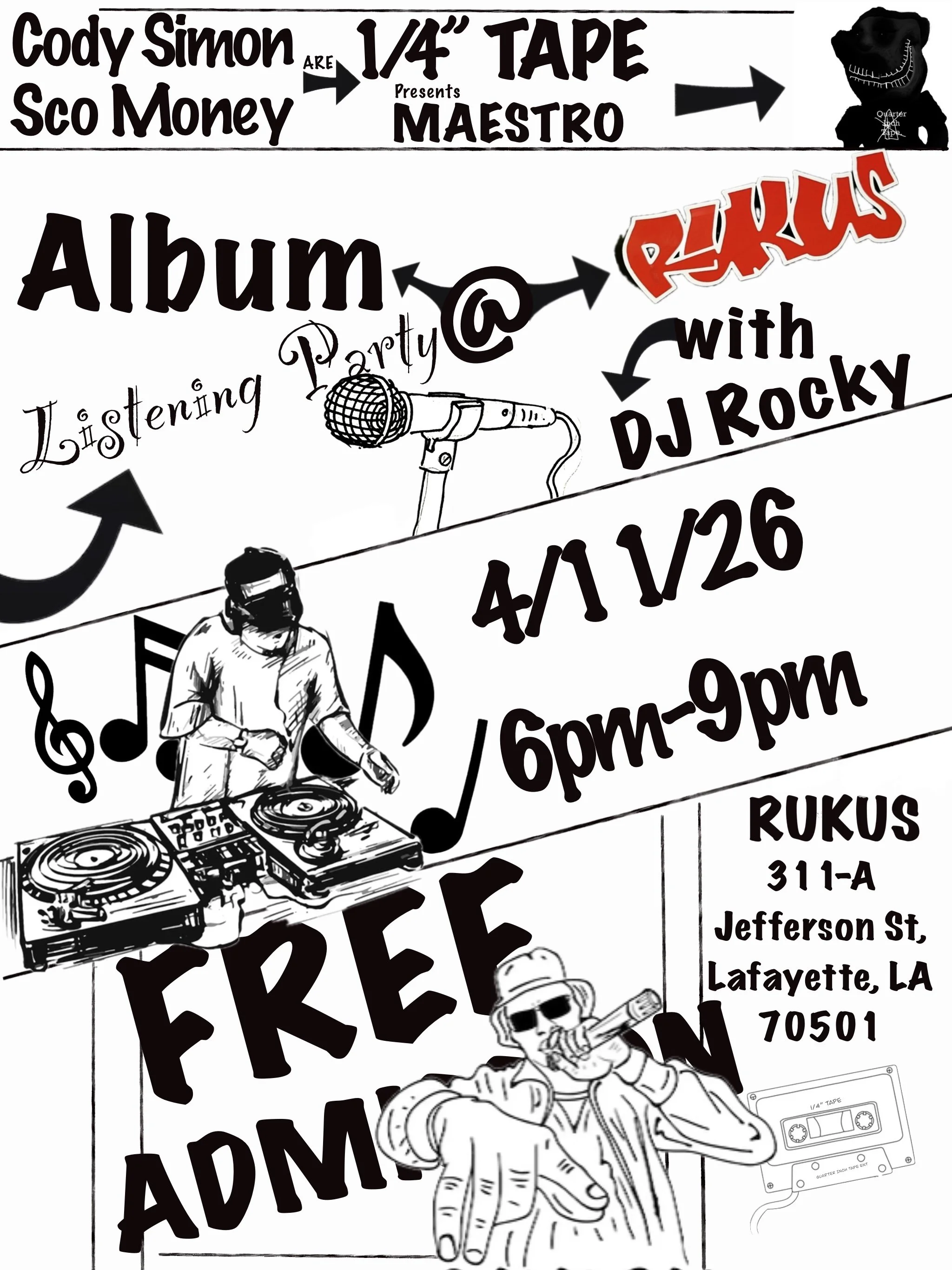 In Maestro, Cody joins Sco Money to form the duo Quarter Inch Tape(1/4” Tape") offers listeners more than music; they open a doorway into their past, community, and soul. This is 1/4” Tape’s Lafayette, a world reimagined in sound and story. And for every listener willing to take the journey, Maestro is more than an album—it’s an invitation to witness the life that shaped the artist Cody has become.